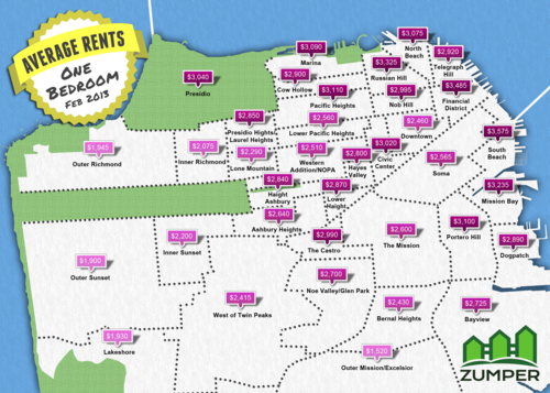 [Above: map showing average rents for one bedroom apartments in San Francisco, Feb 2013 - via Zumper.]